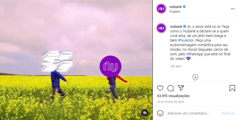O Nubank foi outra empresa que levou mensagens de amor e carinho para todas as pessoas que passam o Dia dos Namorados sozinhas. Em sua campanha de 2019, o banco digital colocou números de WhatsApp à disposição do seu público para criar mensagens de amor customizadas.