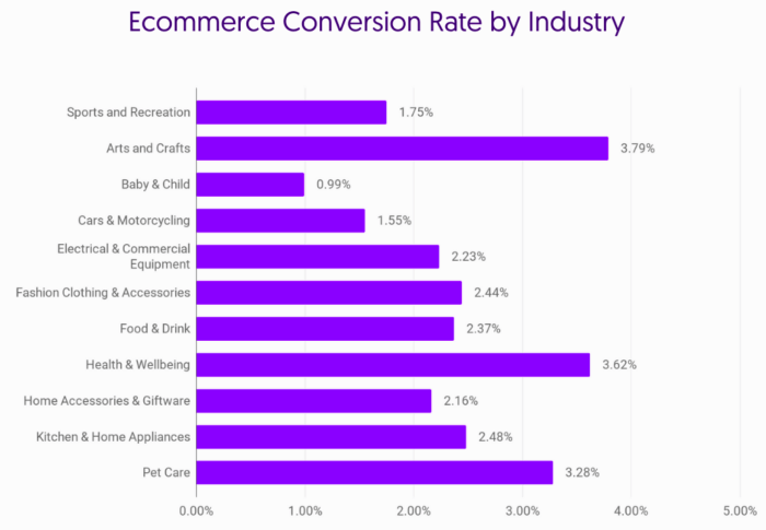 Quando pensamos em taxas médias de conversão, podemos fazer uma análise por indústria, por exemplo. Assim, fica mais fácil detectar se você está dentro do que é esperado em seu mercado. O estudo e-commerce 2021 market data, da Growcode, trouxe o seguinte gráfico, fazendo essa comparação por setor: