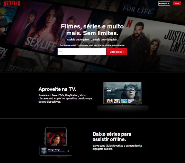 A seção de perguntas e respostas minimiza as objeções dos usuários e aumenta as chances de conversão. Além disso, a landing page é curta, embora o portfólio da plataforma seja enorme — com menos de 200 palavras, a Netflix sabe que a melhor forma de convencer os visitantes é por meio da simplicidade.