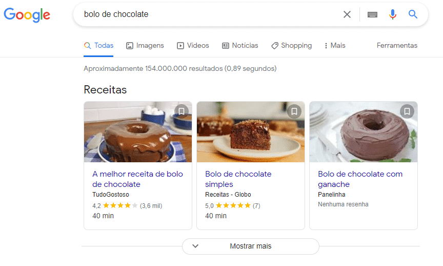 Por exemplo: após fazer uma pesquisa no Google sobre uma receita, o usuário poderá encontrar informações importantes nos resultados. Vejamos um exemplo abaixo.