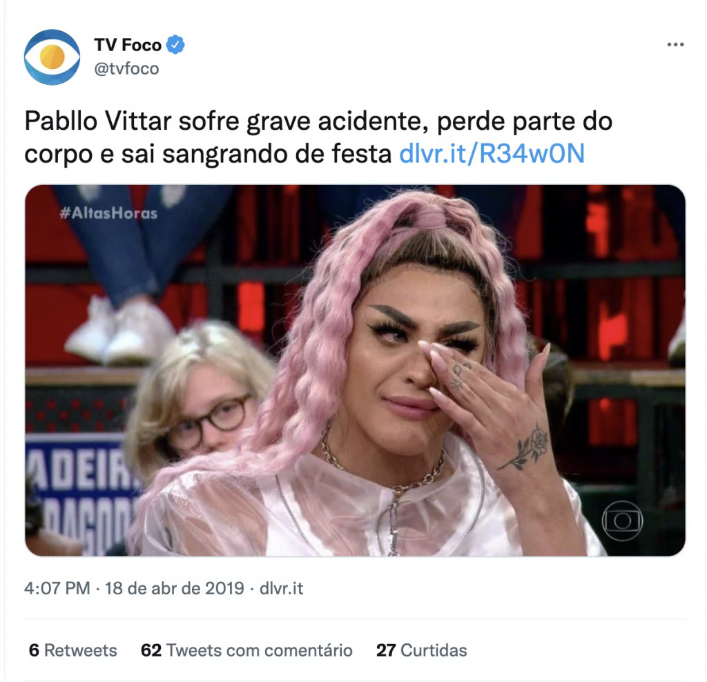 Segundo informa em seu site, o TV Foco é um site de celebridades que existe desde 2006. A página descobriu uma forma de bombar sua audiência: o clickbait sensacionalista. Para você ter uma ideia, entre as manchetes bizarras, por exemplo, uma unha quebrada de Pabllo Vittar virou “perda de parte do corpo”, como vemos no print a seguir.