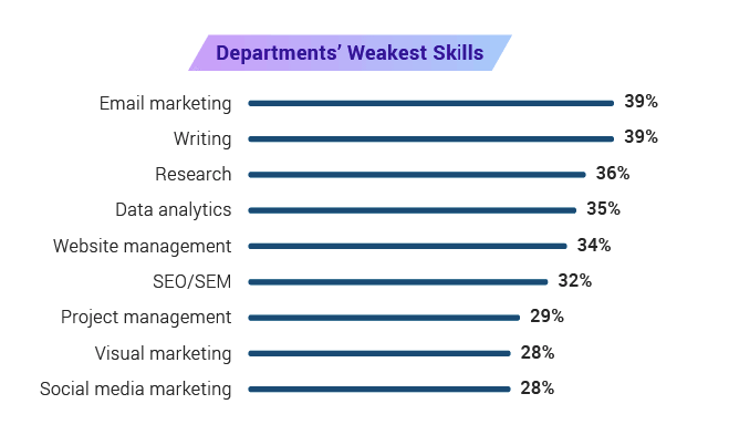 De acordo com a pesquisa, 39% dos entrevistados disseram que Email Marketing e redação são as habilidades mais fracas dos departamentos.