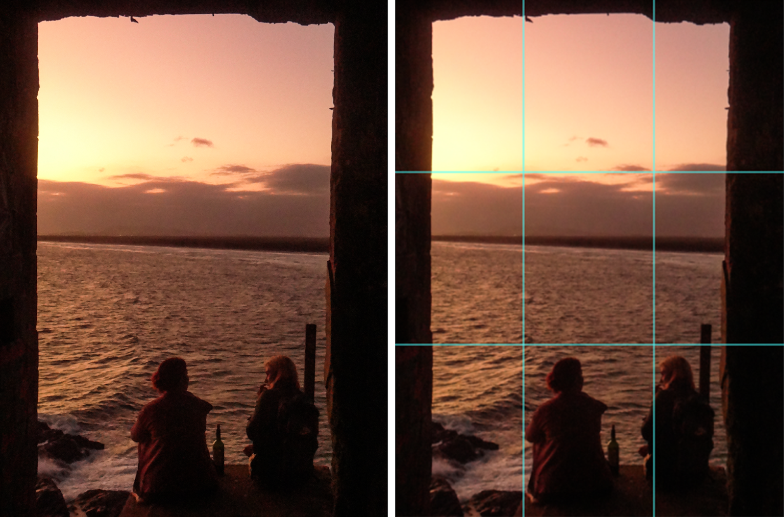 Nesta foto, por exemplo, capturei duas argentinas apreciando o pôr do sol na “Janela do Paraíso”, em Arraial do Cabo, RJ. Essa imagem ilustra bem a composição, aproveitando o enquadramento natural da janela e aplicando a regra dos terços: as duas mulheres ocupam ⅔ da largura e ⅓ da altura da foto.
