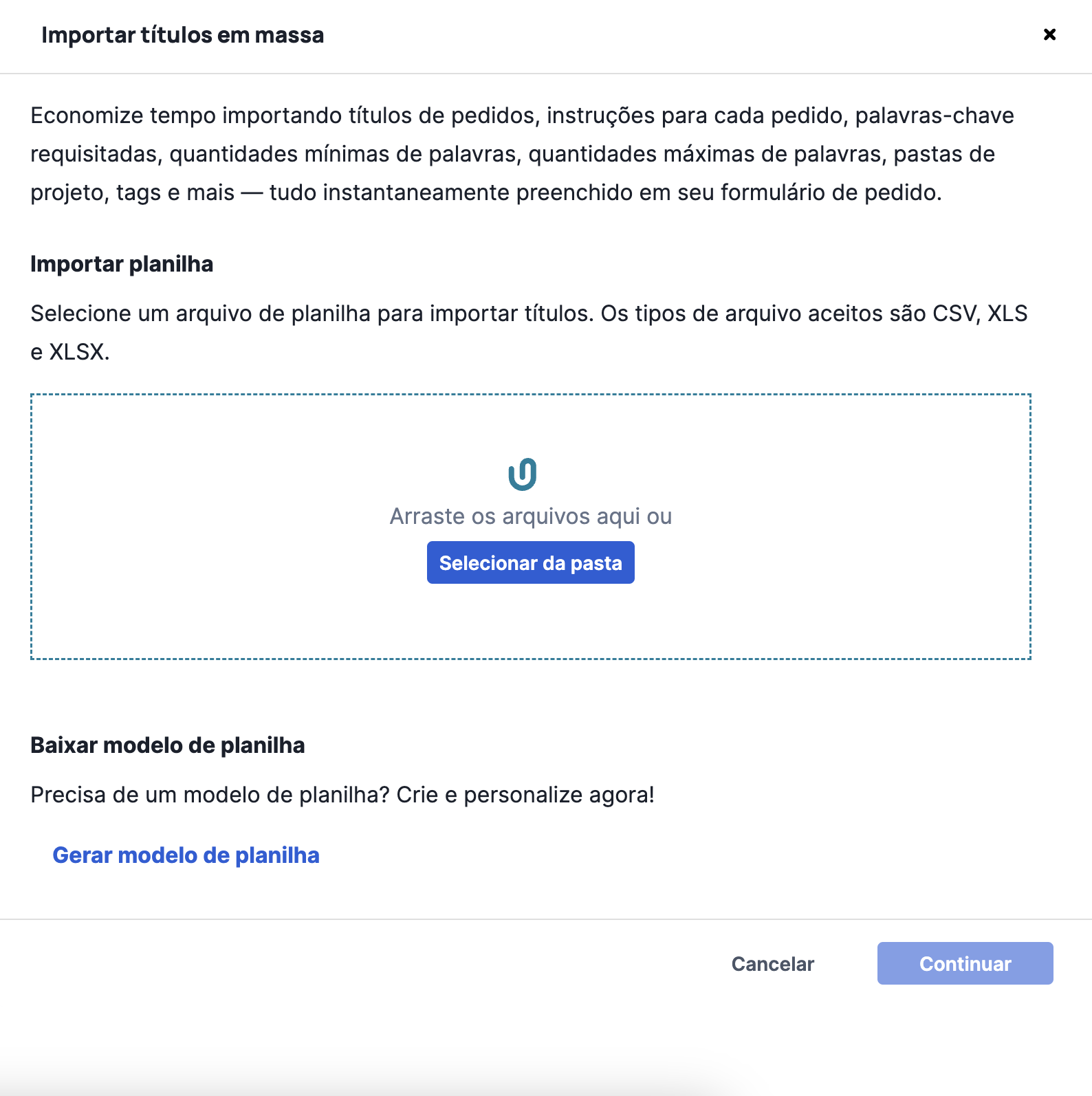 A funcionalidade de “Importar Títulos em Massa” traz comodidade para o seu dia-a-dia, pois permite que você faça o upload de arquivos CSV e faça seus pedidos em massa, ao invés de preencher o briefing de cada conteúdo individualmente.
